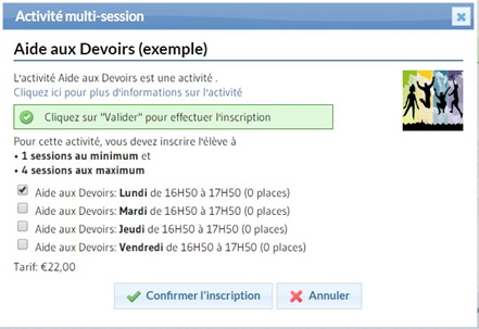 Pour certaines activités multisession (dont certaines avec nombre minimum ou maximum par semaine), il est nécessaire d’indiquer les jours choisis