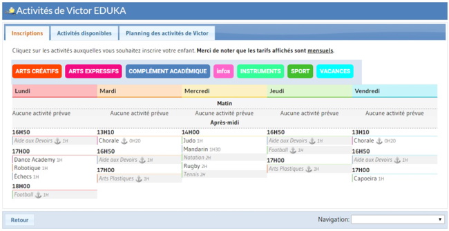 L’Onglet Planning des Activités de l’enfant permet à tout moment de consulter planning hebdomadaire activités de votre enfant.